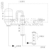 溶液在一个降膜蒸发器里,通过物料循环泵在加热管内循环。初始蒸汽用新鲜蒸汽在管外给热,将溶液加热沸腾产生二次汽,产生的二次汽由涡轮增压风机吸入,经增压后,二次汽温度提高,作为加热热源进入加热室循环蒸发。正常启动后,涡轮压缩机将二次蒸汽吸入,经增压后变为加热蒸汽,就这样源源不断进行循环蒸发。蒸发出的水分最终变成冷凝水排出。
