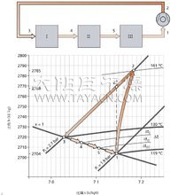 例如:将来自蒸发器的饱和水蒸汽从吸入状态p1=1.9 bar, t1=119 ℃压缩到p2= 2.7 bar, t2=161℃(压缩比 Π= 1.4)。压缩循环沿着多变曲线1-2,蒸汽的比焓增加量Δhp。对于蒸汽的比焓h2,通过压缩机内效率(等熵效率)的等式:在此温度下,它进入到蒸发器的加热器。基于被吸入蒸汽的量,kg/hr。hp 单位多变(有效)压缩功,kJ/kg。hs 单位等熵压缩功,kJ/kg。
