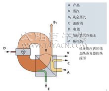 二次蒸汽,经过压缩机的压缩,压力和温度得以升高,热焓随之增加,被送到蒸发器的加热室当作加热蒸汽即生蒸汽使用,使料液维持蒸发状态,而加热蒸汽本 身将热量传递给物料本身冷凝成水。这样,原来要废弃的蒸汽就得到了充分的利用,回收了潜热,又提高了热效率。